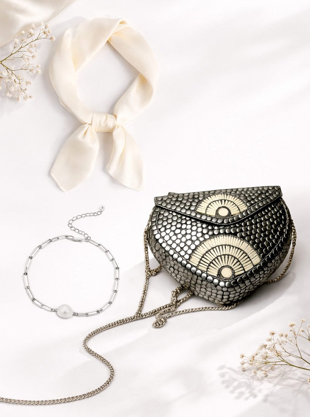 Este trío fue pensado para mujeres que cuidan los detalles y entienden que el estilo está en las pequeñas piezas que elevan un look completo. Peligrosa combina suavidad, brillo y carácter en un conjunto versátil y atemporal. 🤍 ¿Qué incluye este trío? Sarah TobilleraUna pieza delicada y sofisticada que aporta movimiento y luz.Con perla de río y base en Plata 925, su diseño ajustable se adapta con elegancia al tobillo, ideal para climas cálidos, escapadas especiales o looks relajados con intención. Silver Mosaic ClutchUn bolso tipo clutch de estructura rígida, elaborado en metal con revestimiento de mosaico de piedra astillada.Su diseño artístico y su acabado metálico lo convierten en una pieza protagonista, perfecta para eventos, cenas, viajes o noches especiales.Incluye cadena metálica para llevarlo cómodamente al hombro o cruzado, a la altura ideal de la cintura. Pañoleta Satinada ClaraUn toque suave y femenino que completa el trío. Ideal para llevar...